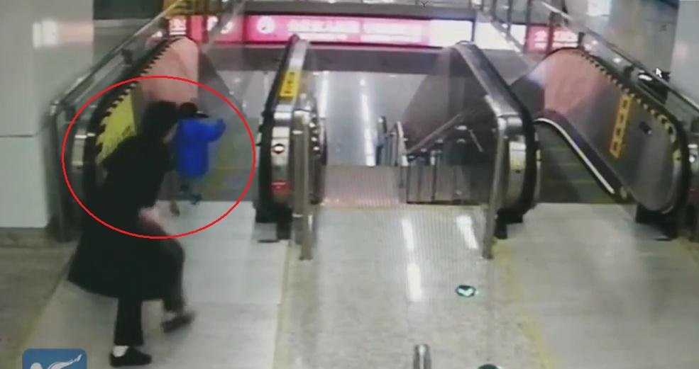 Em bé bước xuống thang cuốn đang đi lên, may mắn được nữ nhân viên ga tàu điện ngầm ở TP Ninh Ba, Trung Quốc ứng cứu trong tích tắc.
