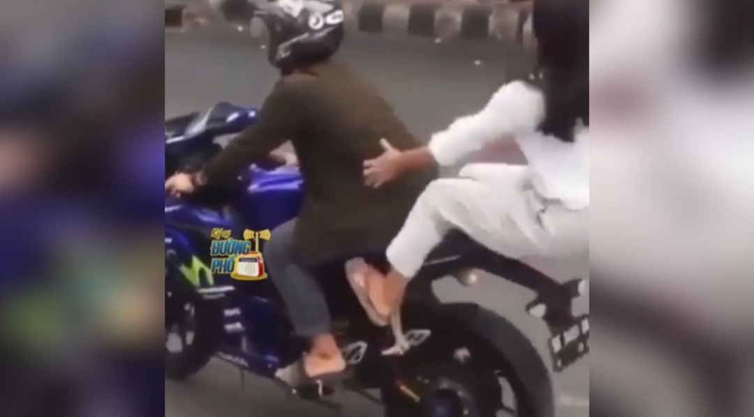 Chàng trai nổ máy lái xe đi trong khi bạn gái còn mải làm dáng, khiến nàng đau điếng vì nện cả "bàn tọa" xuống đường.