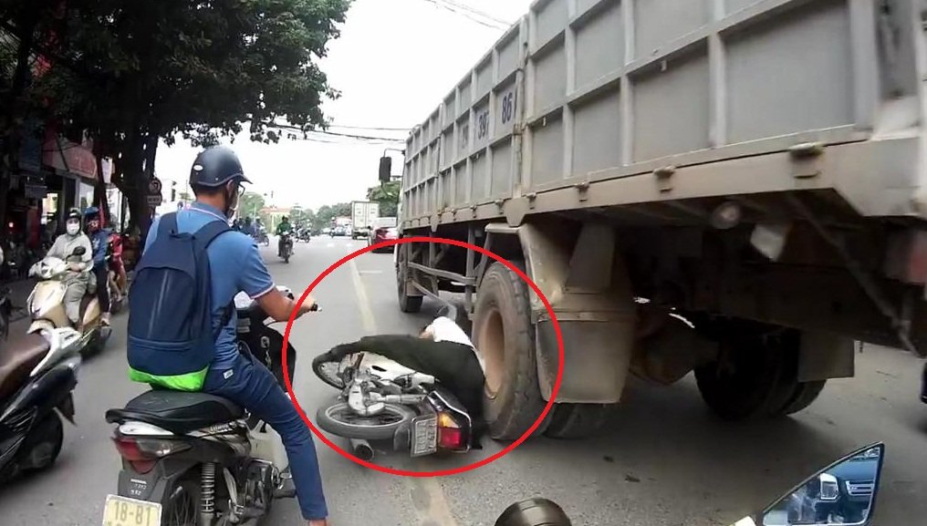 Người đàn ông đi xe Honda Dream lấn sang làn ngược chiều, định vượt xe tải nhưng bị một xe máy khác tạt đầu nên loạng choạng ngã, suýt bị xe tải nghiến qua người.