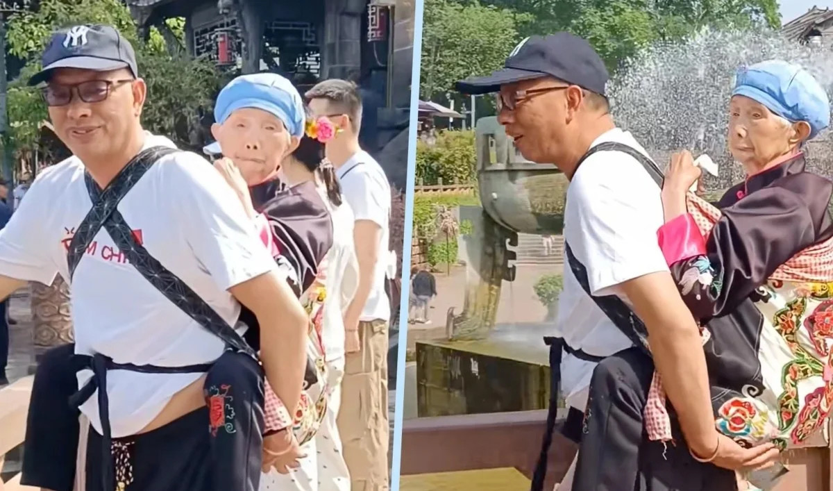 Đoạn video ghi lại cảnh ông Chai Wanbin (51 tuổi, sống tại huyện Huệ Đông, tỉnh Tứ Xuyên, Trung Quốc) sử dụng địu trẻ em truyền thống để địu người mẹ nhỏ nhắn của mình đi du lịch đang trở thành chủ đề bình luận trên mạng xã hội.