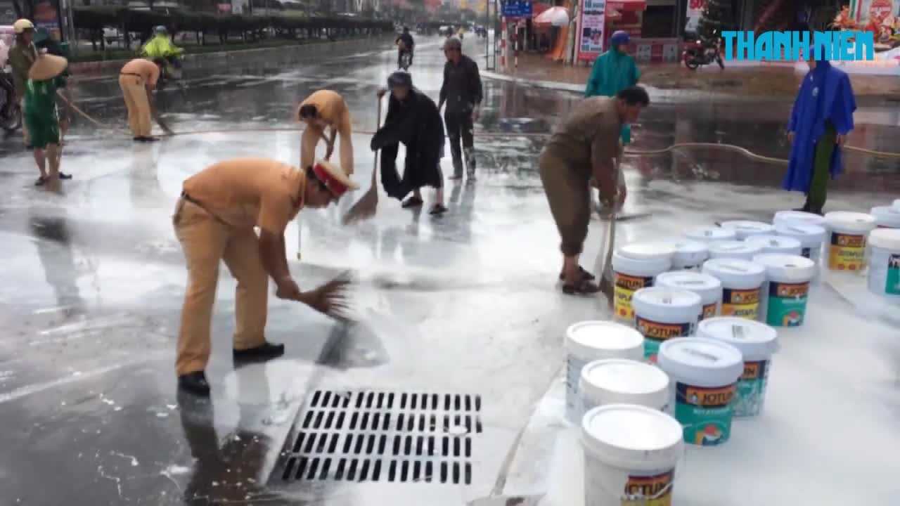 Clip: Công an Cần Thơ dầm mưa dọn sơn đổ ra đường giúp dân
