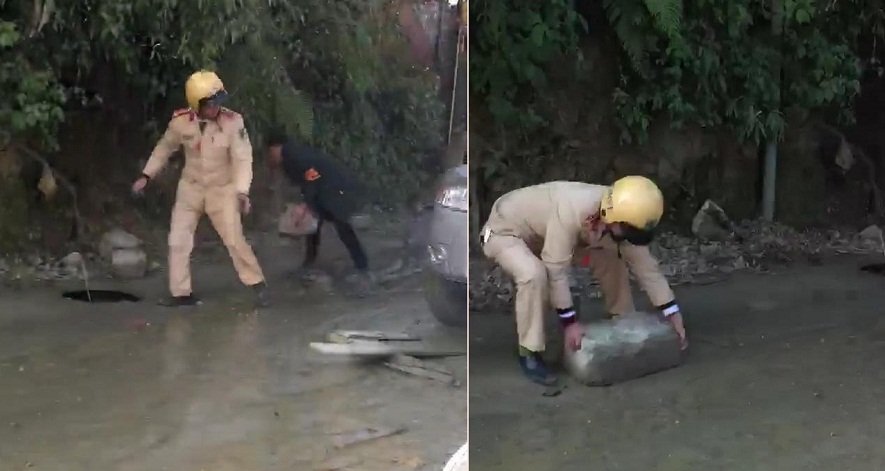 Hình ảnh chiến sỹ CSGT cùng 2 dân phòng dọn đá giúp đường thông thoáng để các phương tiện lưu thông an toàn nhận được cơn mưa lời khen từ cộng đồng mạng.