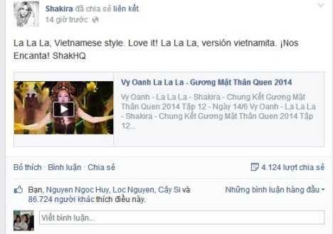 (VTC News) - Trên fanpage Facebook của mình, nữ ca sĩ Shakira bất ngờ chia sẻ link video Vy Oanh thể hiện ca khúc La La La trong đêm chung kết "Gương mặt thân quen 2014".