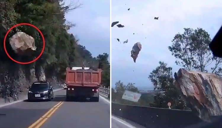 27/11/2018 12:07:00 +07:00Đá tảng lăn lông lốc từ sườn núi xuống cao tốc Su Hua (Đài Loan, Trung Quốc), suýt chút nữa văng trúng hàng loạt ô tô đi bên dưới.