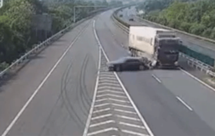 Chiếc xe con đang đi trên cao tốc bỗng dừng lại khiến xe tải phía sau không tránh kịp và gặp tai nạn.