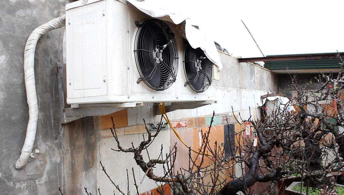 Để chống chọi với cái rét buốt của thời tiết và đảm bảo cho đào nở đúng độ, một chủ vườn Nhật Tân đã trang bị điều hòa 2 chiều, đưa những gốc đào quý vào lô cốt