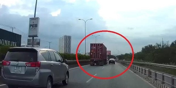 Chiếc ôtô con chạy gần container rơi vào điểm mù, bị chiếc xe lớn hơn đâm xoay ngang giữa đường.