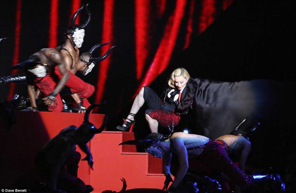 Tối 25/2, trên sân khấu Lễ trao giải Brit Awards, nữ hoàng nhạc pop Madoona bất ngờ bị ngã nhào xuống trong khi cô đang trình diễn ca khúc 'Living for love'.