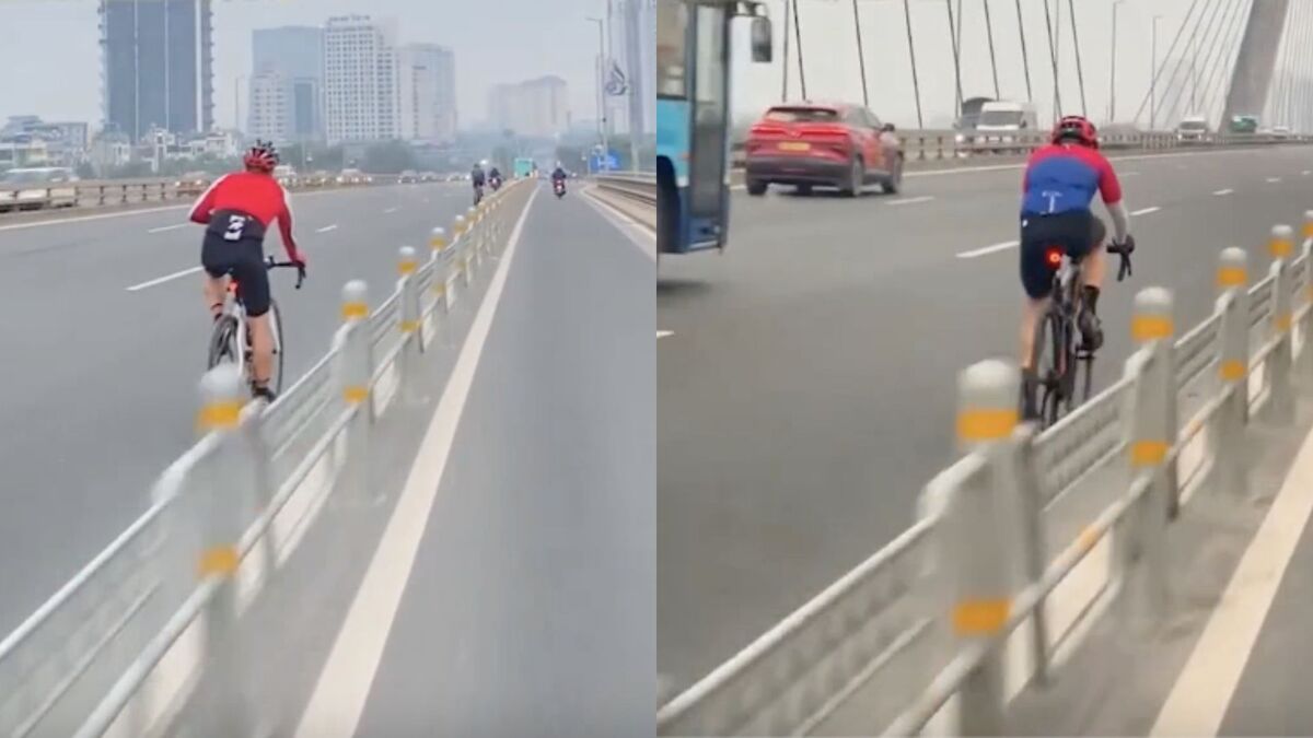 Clip đoàn người đạp xe vào làn ô tô trên cầu Nhật Tân, Hà Nội được ghi lại bằng camera hành trình 360° gắn trên mũ bảo hiểm. (Nguồn: @khamphavietcungtoi)
