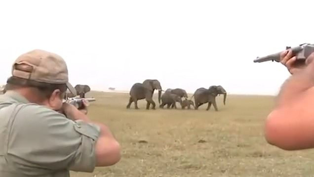 Hình ảnh từ clip cho thấy, 2 thợ săn ngắm bắn một đàn voi từ xa. Một trong 2 người nói với người kia “bắn vào giữa mắt nó”. Sau đó, cả hai nổ súng bắn một con voi trong đàn khiến nó ngã khuỵu. Cả đàn voi hoảng loạn, vài giây sau, chúng hung dữ lao về phía các thợ săn – lúc này đang cuống cuồng bỏ chạy.