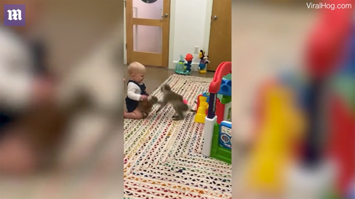 Clip: Em bé 'chiến đấu' với chú khỉ để giành đồ chơi