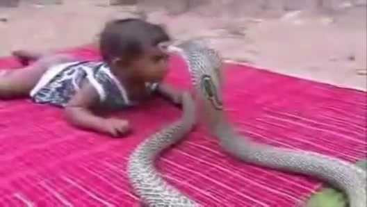 (VTC News) - Một em bé da đen được bố mẹ đặt ngoài sân, vô tư chơi đùa với rắn hổ mang chúa, loài rắn cực độc.