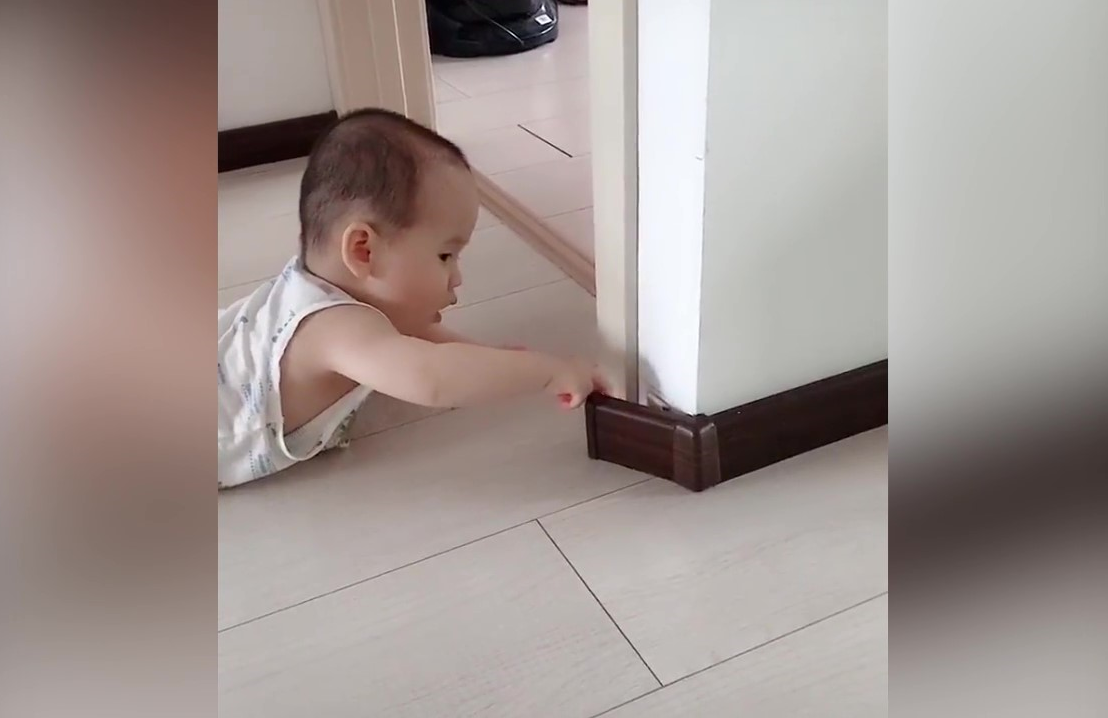 Đang nằm chơi một mình, em bé bỗng nhiên mò được nắm tiền do bố hoặc mẹ giấu trong góc tường.