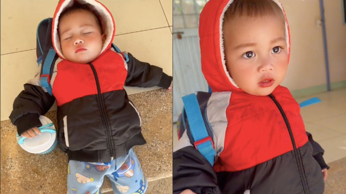 Trong clip đang được lan truyền mạnh trên mạng xã hội TikTok, em bé 2 tuổi mặc áo phao, đi chân đất, lấy balo làm gối và đệm, nằm ngủ ngon lành trước cửa lớp học đang khóa cửa, tay vẫn nắm chặt lồng cơm. Lúc này còn quá sớm nên các bạn khác chưa tới. Cô giáo phải gọi mấy lần, em bé mới tỉnh dậy, vẻ mặt vẫn còn ngơ ngác. Tuy ngái ngủ nhưng bé vẫn trả lời đúng khi được hỏi "cô giáo nào đây". Sau đó, cậu học trò nhỏ ngoan ngoãn vào cất đồ và ăn bim bim.