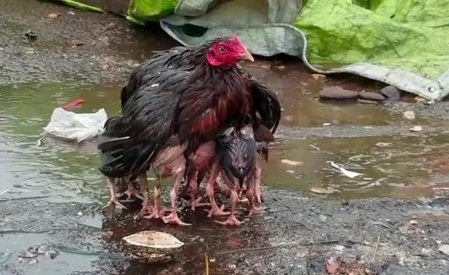 Hình ảnh gà mẹ dang rộng cánh che chở đàn con trong cơn mưa tầm tã khiến hàng triệu người xem cảm động.