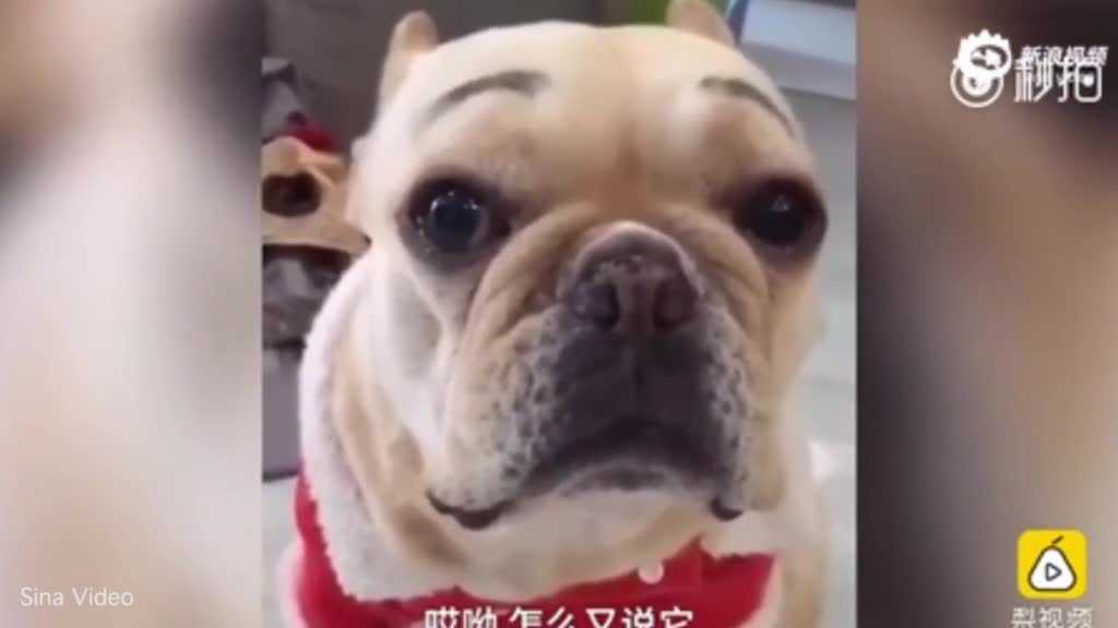 Chú chó mắt rưng rưng lệ, tỏ vẻ hối lỗi khi bị cô chủ mắng vì tội phá hoại đồ đạc, cặp lông mày được cô chủ tô vẽ thêm càng khiến bộ dạng chú ta thêm hài hước.