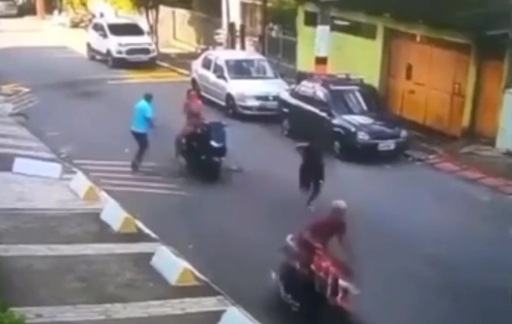 Vừa chặn đầu xe đôi trai gái trên đường thì phát hiện ô tô cảnh sát phía sau, tên cướp vội phóng xe trốn, mặc kệ đồng bọn đang "cong đuôi" chạy bộ.