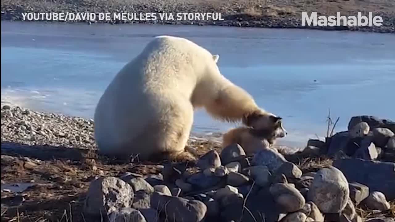 Một hướng dẫn viên du lịch ở Canada đã ghi lại khoảnh khắc vô cùng dễ thương khi chú gấu Bắc Cực to lớn giơ chân xoa đầu chú chó trượt tuyết một cách nhẹ nhàng, tình cảm..