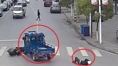 Sự việc xảy ra ngày 4/3 tại huyện Như Đông, tỉnh Giang Tô, Trung Quốc. Người lái xe ba bánh sau đó bị bao vây và bắt lên đồn cảnh sát. Người này bị phạt 2.000 NDT (khoảng 7 triệu đồng) và bị quản chế hành chính 15 ngày vì bỏ chạy sau khi gây tai nạn.