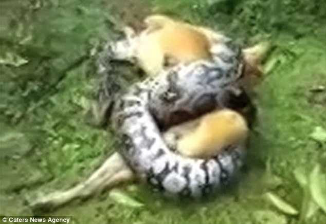 đang quấn lấy chú mồi là chó bị chủ nhà dùng cành cây đập bèn từ từ trườn vào bụi cây, buông tha con mồi.