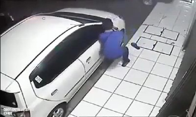 Dùng hết sức bình sinh để bẻ gương ô tô, thậm chí đu cả thân mình vẫn không bẻ gãy nổi, hai tên trộm đen đủi phải bất lực bỏ đi.