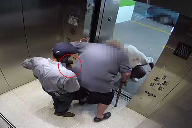 Cảnh quay từ camera an ninh cho thấy hai tên trộm đã phối hợp ăn ý để móc túi một cụ ông chống gậy trong thang máy.
