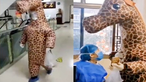 Có việc phải vào viện nhưng lại hết khẩu trang, người phụ nữ diện nguyên bộ trang phục hươu cao cổ nhằm tránh Covid-19.