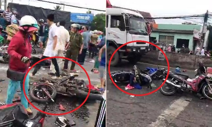 Hàng loạt xe máy đang dừng chờ đèn đỏ bị xe container tông thẳng, cuốn vào gầm khiến nhiều người thương vong tại ngã tư Kim Long, huyện Bến Lức, tỉnh Long An.