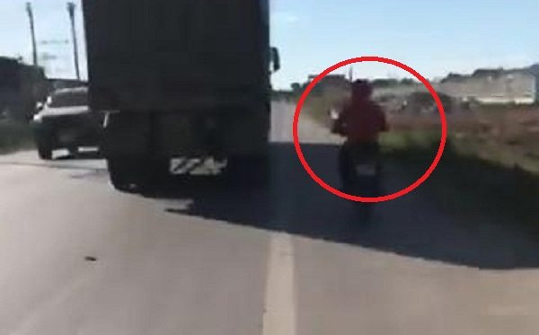 Clip: Hoảng hồn 'ninja' xe máy núp hông container để tránh nắng