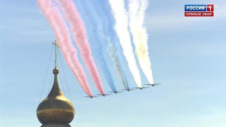 75 máy bay, gồm 55 máy bay phản lực và 20 trực thăng vẽ lên bầu trời Quảng trường Đỏ lá quốc kỳ Nga nhân Ngày Chiến thắng Phát xít Đức (1945-2020).