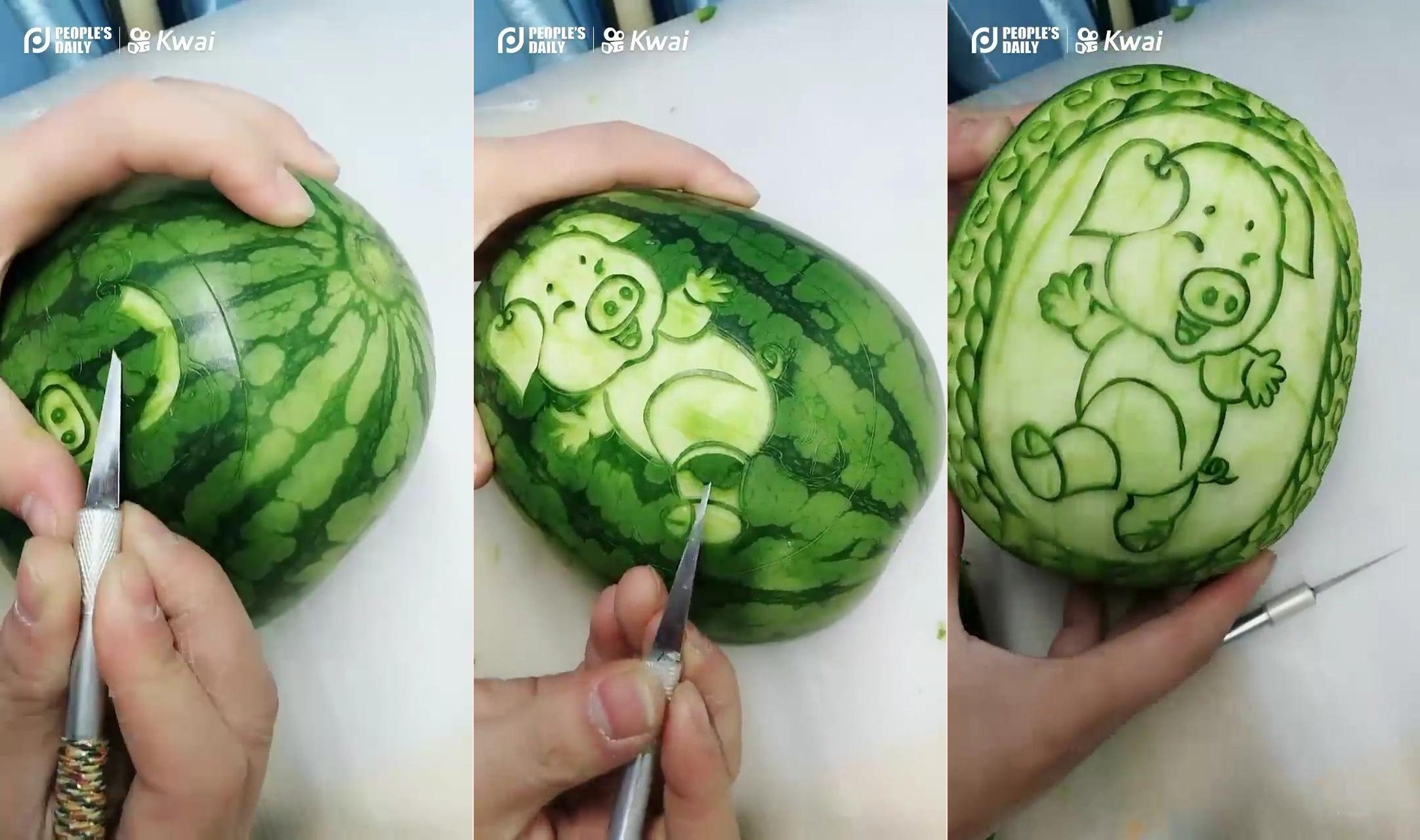 Người thợ cắt tỉa hoa quả khéo léo khắc hình chú lợn ngộ nghĩnh trên vỏ dưa hấu khiến người xem tròn mắt.