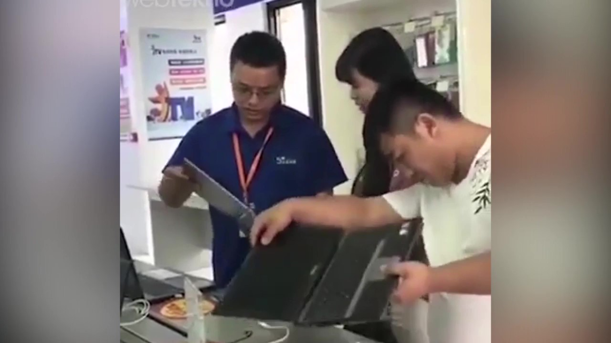 Clip: Khách hàng ngố 'đực mặt' khi làm gãy đôi máy tính