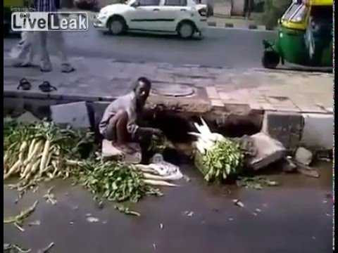 Cảnh một người đàn ông Ấn Độ vô tư bày rau củ ra đường và tận dụng nước cống ngay đó để rửa rau khiến người xem rùng mình kinh hãi.