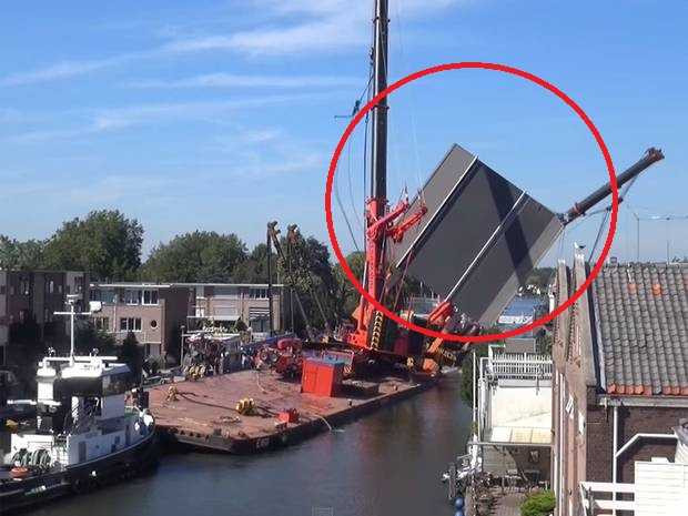 Trong khi vận chuyển một phần của cây cầu Juliana ở một thị trấn thuộc Hà Lan, 2 chiếc cần cẩu đã bị mất thăng bằng và đổ sập xuống phá hủy 20 ngôi nhà.