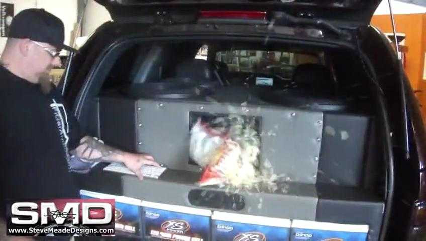 Với hệ thống âm thanh công suất 30000w của thương hiệu Rockford Fosgate, gói khoai tây chiên bị nghiền nát ngay lập tức.