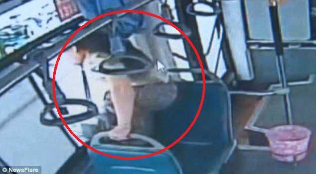 Nhân lúc xe buýt dừng lại ở một ngã tư, người phụ nữ liều mình trèo xuống đường giữa dòng xe cộ đông đúc, may mắn là cô không hề hấn gì.