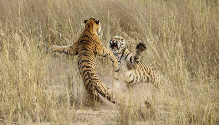 Con lợn rừng tiến một bước, ''chúa sơn lâm'' cúi thấp thân mình một chút. Khi đến khoảng cách phù hợp, con hổ ngay lập phóng mình lên khỏi mặt nước, lao tới cắn vào lưng con mồi.