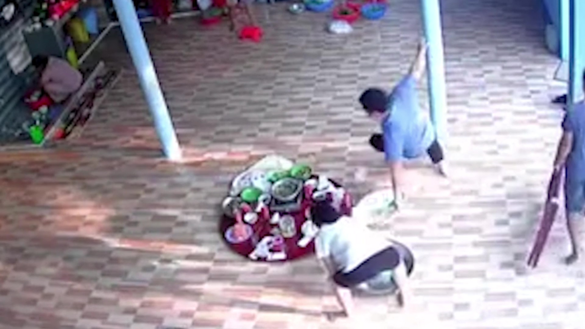 Cùng một vị trí cạnh mâm cơm, hai người đàn ông xui xẻo bị ngã đau điếng mà không rõ lý do.
