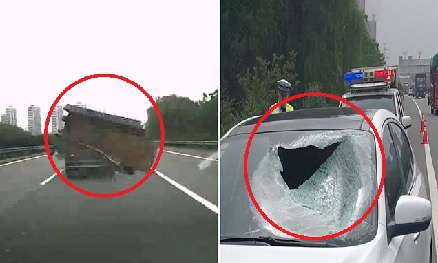Tai nạn xảy ra ngày 26/4 tại TP Tây An, tỉnh Thiểm Tây, Trung Quốc. Hình ảnh từ clip cho thấy, mảnh sắt lớn văng lên không trung sau khi một chiếc ô tô màu đen đi qua.