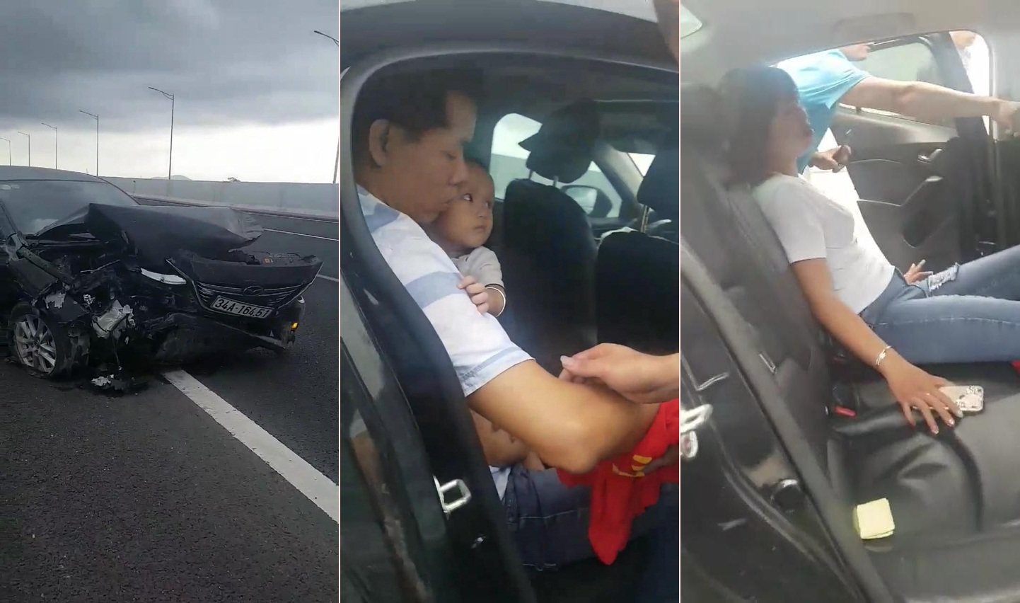 Tại hiện trường, ô tô Mazda biến dạng tan nát phần đầu, túi khí ở cả ghế lái và ghế phụ đều bung. Nam tài xế Mazda cùng đứa con nhỏ và người vợ lần lượt được các tài xế khẩn trương ứng cứu, dìu ra ngoài, vẫy xe đưa ra khỏi cao tốc. May mắn, một tài xế xe khách 16 chỗ đã tốt bụng dừng lại, cho cả gia đình đi nhờ.