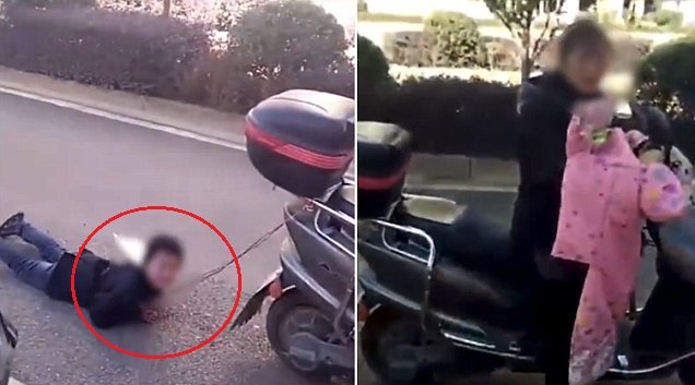 Một cậu bé khoảng 7 tuổi bị mẹ trói bằng dây thừng vào sau xe máy và kéo lê trên đường phố Chiêu Thông ở tỉnh Vân Nam, Trung Quốc.