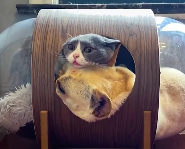 Sau nhiều lần ngăn cản thất bại, mèo đành bất lực nằm yên một góc cho chú chó thoải mái chiếm tiện nghi trong "nhà" mình.