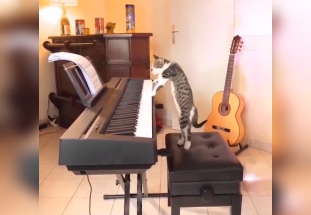 Dáng vẻ gồng mình của mèo khi đứng hai chân trên ghế, hai chân còn lại nhấn phím piano trong lúc mắt như nhìn vào bản nhạc khiến người xem khó nhịn cười.