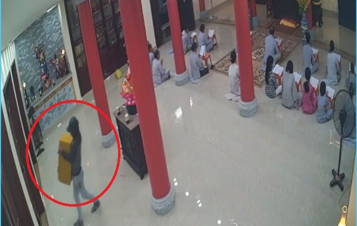 Nam thanh niên lẻn vào chùa bê thùng công đức bỏ chạy, dù nhiều người đang ngồi tụng kinh; toàn bộ sự việc xảy ra trong vòng 15 giây.