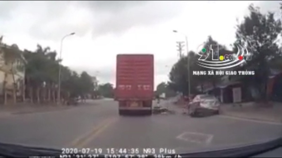 Một nam thanh niên đi xe máy với tốc độ cao, vượt ẩu rồi tông vào người phụ nữ đi cùng chiều, sau đó ngã ra đường suýt bị xe container cán qua người.