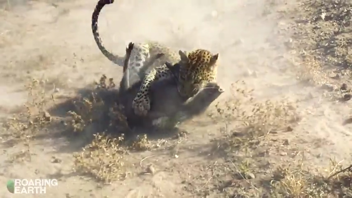 Báo hoa mai ẩn thân sau bụi cây, chờ đàn lợn rừng châu Phi ra khỏi hang, lựa chọn 1 đối tượng rồi tung đòn chí mạng.