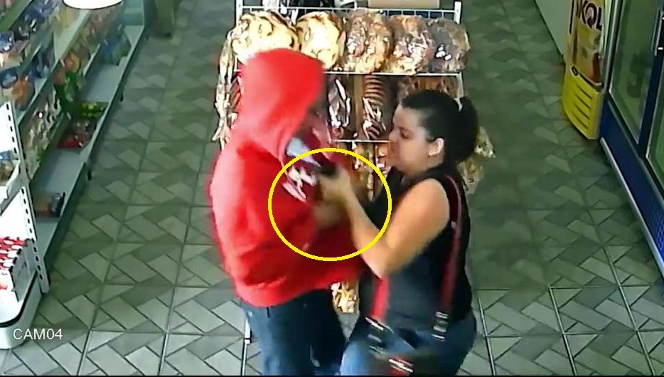 Sự việc xảy ra ngày 5/6 tại một cửa hàng tạp hóa ở São José do Rio Preto, Brazil. May mắn cho nữ khách hàng, đúng là tên cướp dùng súng giả. Tuy nhiên, sau một hồi giằng co, sức cô gái đấu không lại với tên cướp, đành để hắn lấy đi ví tiền cùng chìa khóa ô tô của cô rồi tẩu thoát.
