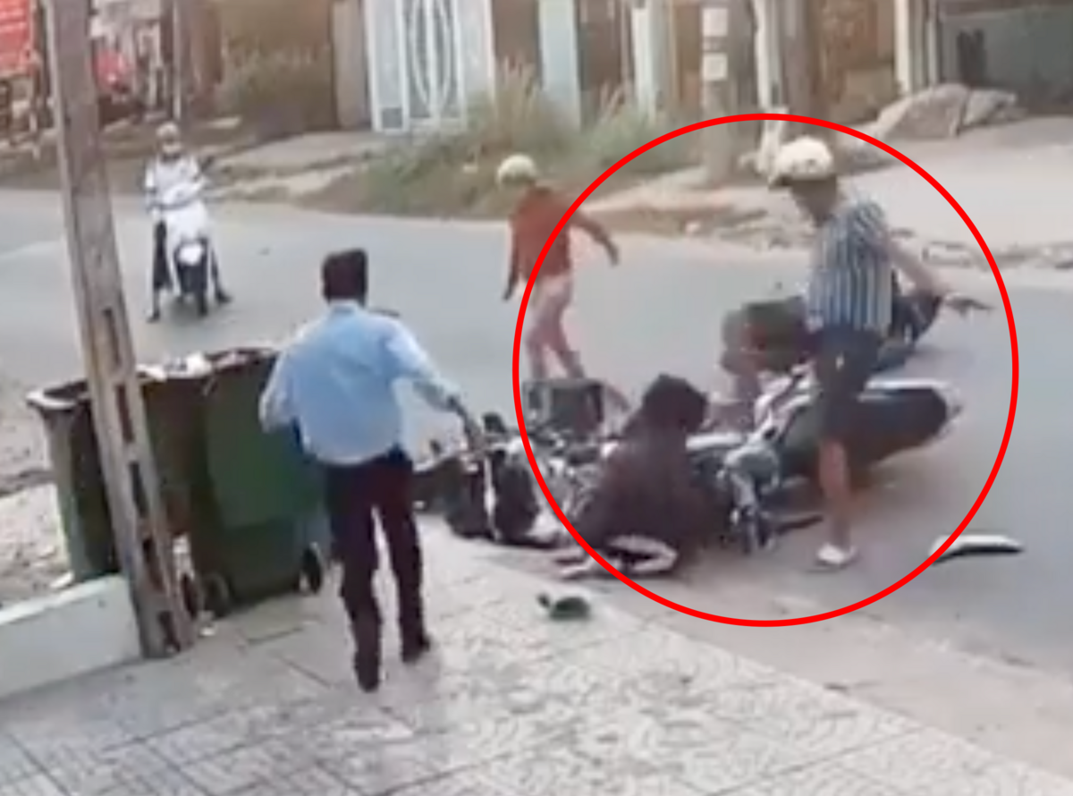 Khi 2 nữ sinh chưa kịp đứng dậy thì người đàn ông điều khiển xa máy lập tức chạy tới đạp liên tiếp vào mặt, bụng và người một nữ sinh.