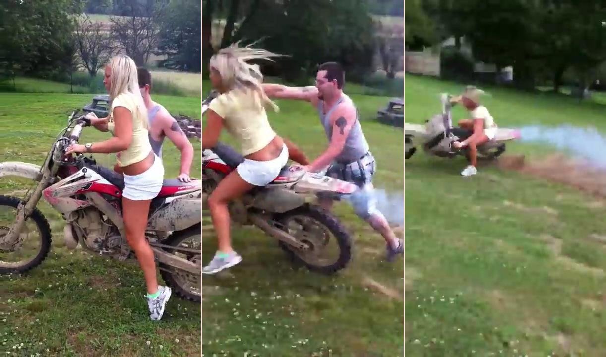 Cô gái Mỹ xinh đẹp lần đầu thử lái mô tô cào cào (dirt bike), ngã nháo nhào vì chiếc xe đột ngột vọt đi.