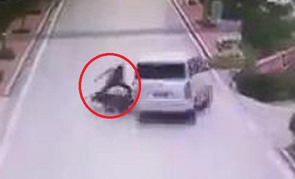 Sự việc được cho là xảy ra tại Trung Quốc. Người đàn ông đi xe máy qua đường không quan sát, va chạm với ô tô khiến xe máy đổ kềnh, ô tô lao xuống vệ đường lật nghiêng.